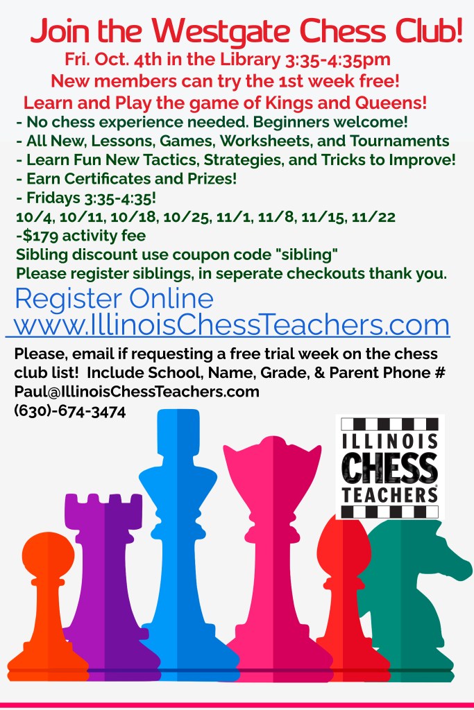 Westgate Chess Club BEGINNERS & ALL GRADES WELCOME! Learn and Play the game of Kings and Queens! Share this: Click to share on X (Opens in new window) X Click to share on Facebook (Opens in new window) Facebook Like Loading...